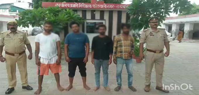 रायबरेली में पुलिस अधीक्षक के निर्देश पर अपराध में अपराधियों के विरुद्ध चलाए जा रहे अभियान के अंतर्गत आज दिनांक 24 अगस्त 2024 दिन शनिवार को समय करीब 12:00 बजे रायबरेली जनपद की कोतवाली नगर पुलिस टीम ने थाना क्षेत्र मैं धरपकड़ अभियान चलाकर चार वंचित वारंटी अभियुक्तों को गिरफ्तार किया है। गिरफ्तार अभियुक्तों को कोतवाली नगर पर लाकर अभियोग पंजीकृत करते हुए न्यायिक अभिरक्षा में भेज दिया गया है। शहर कोतवाल राजेश सिंह ने बताया कि गिरफ्तार अभियुक्तों में मोहम्मद वकील उर्फ बावले पुत्र मोहम्मद इदरीश निवासी आजाद नगर थाना कोतवाली नगर जनपद रायबरेली आकाश कश्यप पुत्र कृष्ण गोपाल निवासी पुलिस लाइन चौराहा दौलताबाद थाना कोतवाली नगर जनपद रायबरेली संदीप सोनकर पुत्र रामसेवक निवासी चक दौलताबाद थाना कोतवाली नगर जनपद रायबरेली नदीम पुत्र गज्जन निवासी खाली सहाट शाहटोला थाना कोतवाली नगर जनपद रायबरेली को गिरफ्तार किया गया है। गिरफ्तार अभियुक्तों पर अभियोग पंजीकृत करते हुए न्यायिक अभिरक्षा में भेज दिया गया है व अग्रिम विधिक कार्यवाही की जा रही है।