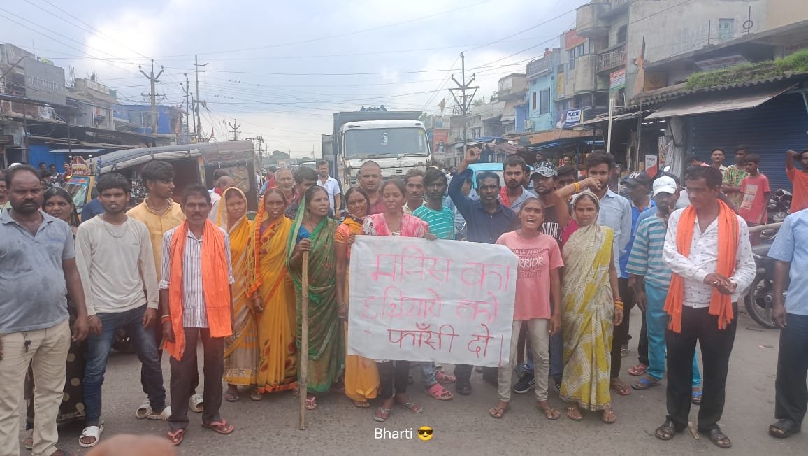 आक्रोशित ग्रामीणों ने मंगलवार सुबह कथारा चौक किया जाम, हत्यारे को फांसी दो के लगे नारे