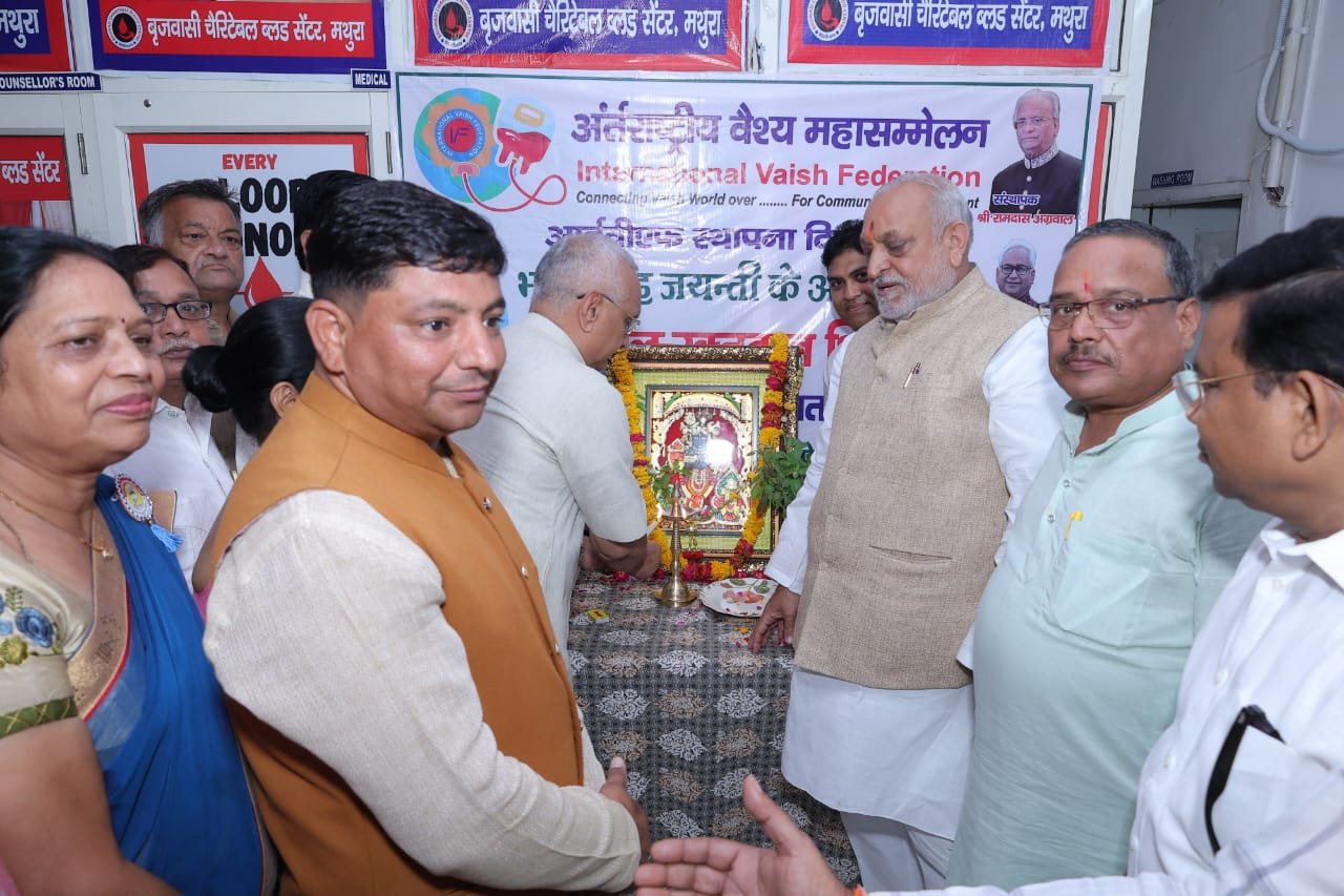 अंतर्राष्ट्रीय वैश्य महासम्मेलन के स्थापना दिवस और भामाशाह जयन्ती के अवसर पर विशाल रक्तदान शिविर का आयोजन रविवार को बृजवासी चैरिटेबिल ब्लड बैंक मसानी पर आयोजित किया गया। रक्तदान शिविर में वैश्य समाज के लोगों ने बढचढ कर सहभागिता दिखाई। रक्तदान शिविर का उद्घाटन आईवीएफ के राष्ट्रीय कार्यकारी अध्यक्ष एवं पूर्व मंत्री रविकांत गर्ग, मथुरा वृंदावन महापौर विनोद अग्रवाल तथा कोसीकलां नगर पालिका अध्यक्ष धर्मवीर अग्रवाल द्वारा संयुक्त रुप दीप प्रज्जवलित कर किया गया। रक्तदान शिविर में सुबह 10 बजे से सायं 6 बजे तक रक्तवीरों का तांता लगा रहा। आईवीएफ की महिला ईकाई ने भी शिविर में अपना सम्पूर्ण योगदान दिया। महापौर विनोद अग्रवाल ने इस अवसर पर कहा कि वैश्य हमेशा सर्व समाज के लिये अपना हर तरह से योगदान देता आया है और आगे भी अपना योगदान देता रहेगा। मथुरा में विशाल रक्तदान शिविर का आयोजन इस बात का प्रमाण है। जिला अध्यक्ष सचिन अग्रवाल ने बताया की विश्व रक्तदान दिवस 14 जून से आईवीएफ स्थापना दिवस 6 जुलाई तक संपूर्ण भारतवर्ष में सामूहिक रूप से राष्ट्रीय अध्यक्ष अशोक अग्रवाल जी के आह्वान पर 100000 रक्त यूनिट देने का जो बीड़ा उठाया गया है उसी क्रम में आज मथुरा में करीब 160 रक्त वीरों द्वारा रक्तदान किया गया है। इस अवसर पर रक्तवीरों को प्रमाण पत्र, शुगर मशीन किट, फर्स्ट ऐड बॉक्स एवं हेलमेट उपहार में दिये गये।
