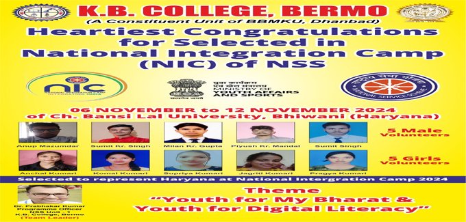 के बी कॉलेज बेरमो के राष्ट्रीय सेवा योजना ( एन एस एस ) के दस स्वयं सेवक नेशनल इंटीग्रेशन कैंप के लिए चयनित