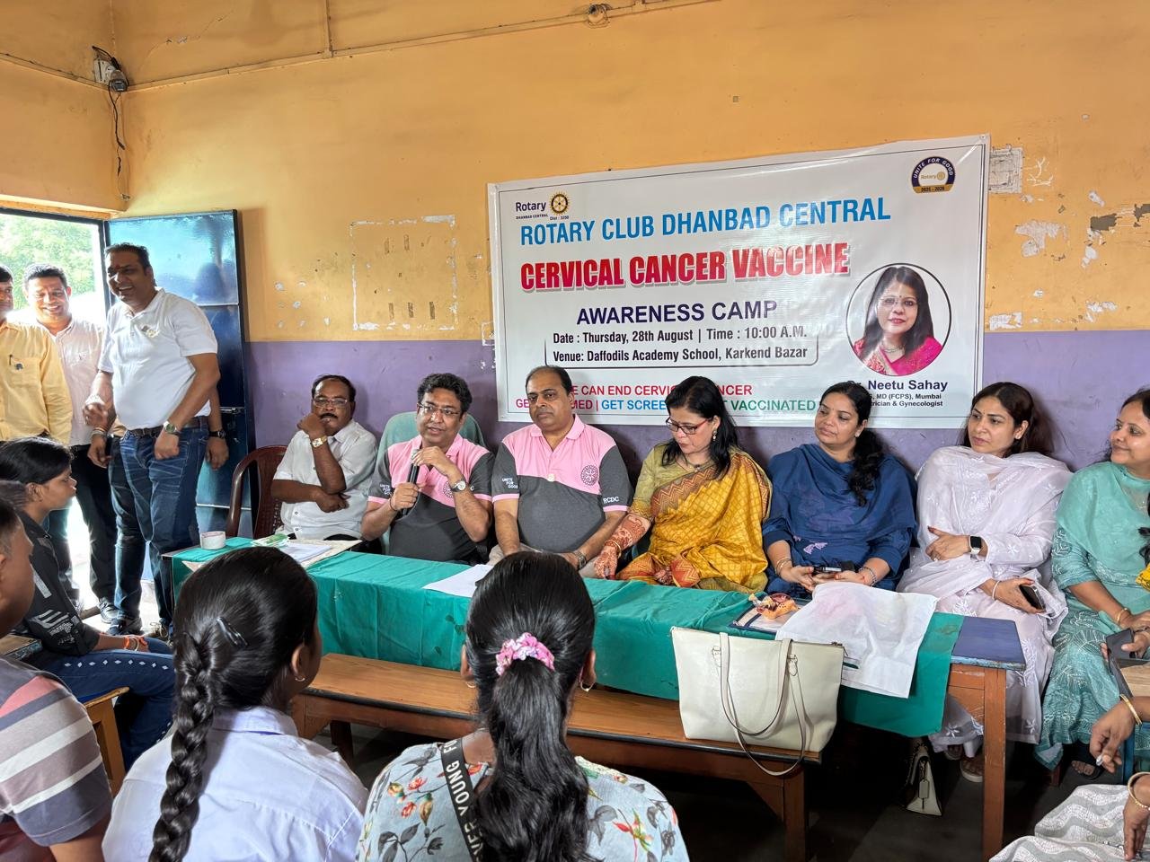 केंदुआ : आज, गुरुवार दिनांक 28 अगस्त करकेंद बाजार स्थित डैफोडिल्स, एकाडेमी में रोटरी क्लब धनबाद सेंट्रल के तत्वावधान में सर्वाइकल केंसर टीकाकरण जागरूकता शिविर का आयोजन किया गया। इस जागरूकता शिविर में डाक्टर नितू सहाय एवं डाक्टर विभास सहाय इस केंसर के दुष्प्रभाव एवं उससे बचने के उपाय के बारे में सभी को विषेश जानकारिया दिया। इस शिविर में लगभग 100 विद्यालय के छात्रा, अभिभावक एवं शिक्षिका उपस्थित थे। विद्यालय प्राचार्य तापस बनर्जी ने रोटरी क्लब के सभी सदस्यो एवं अभिभावको गर्मजोशी के साथ स्वागत किया। उन्होने बताया कि यह डैफोडिल्स एकाडेमी के छात्राओ का सोभाग्य है कि रोटरी क्लब, धनबाद के द्वारा इस शिविर का आयोजन किया गया एवं निशुल्क टीकाकरण भी किया जाएगा।
