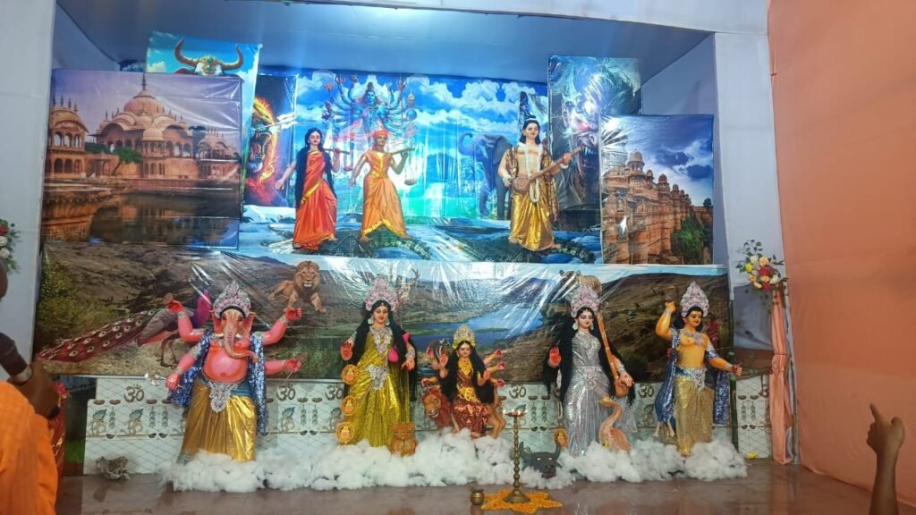 सजावट और प्रकाश व्यवस्था: रंग-बिरंगी रोशनी, फूलों की सजावट, और पारंपरिक कला के तत्वों ने पंडाल को और भी आकर्षक बनाया है।