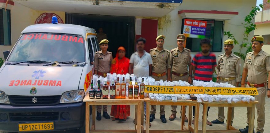 आज़मगढ़ ज़िले के जहानागंज थाना की पुलिस और आबकारी विभाग की टीम ने मिलकर एंबुलेंस के माध्यम से शराब तस्करी करने वाले तीन लोगों को गिरफ्तार किया है। जिनमें एक महिला भी शामिल है, पुलिस ने एंबुलेंस से भारी मात्रा में अंग्रेजी शराब और फर्जी गाड़ी के नंबर प्लेट भी बरामद किए हैं।