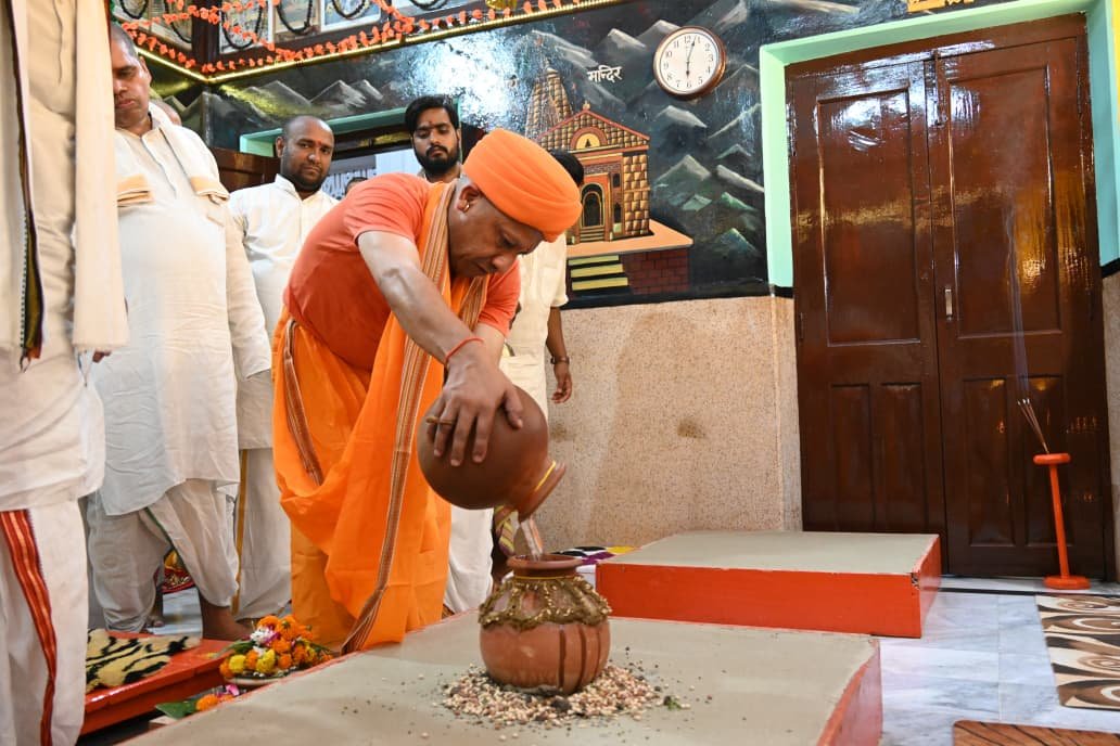 इसके बाद जल से भरा कलश मुख्यमंत्री योगी आदित्यनाथ ने स्वयं उठाया और शक्तिपीठ के गर्भगृह में वैदिक मंत्रोच्चार के बीच वरुण देवता का आवाहन कर इसे स्थापित किया। गोरक्षपीठाधीश्वर ने सबसे पहले मां दुर्गा, भगवान शिव और गुरु गोरखनाथ के शस्त्र त्रिशूल को प्रतिष्ठित करके गौरी-गणेश की आराधना की। इसके साथ ही दुर्गा मंदिर (शक्तिपीठ) के गर्भगृह में श्रीमददेवीभागवत का पारायण पाठ एवं श्रीदुर्गासप्तशती के पाठ का भी शुभारंभ हो गया। पाठ के उपरांत आरती एवं प्रसाद वितरण किया गया।